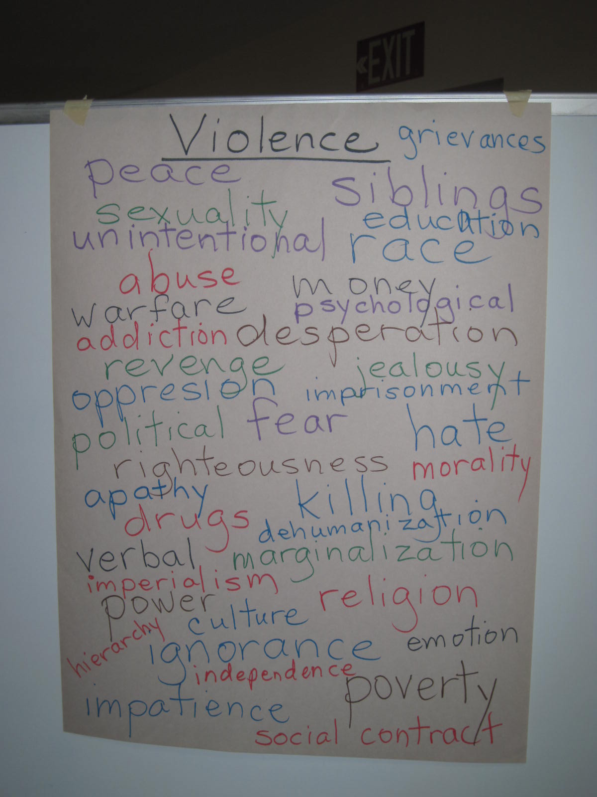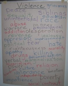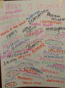 of the exercises we do in a Basic AVP workshop is a brainstorm on the topic, “What is Violence?” Participants say whatever word or short phrase comes to mind when they think of violence and it is transcribed onto a sheet of poster paper. It is a word storm of ideas. No one’s idea is censored. When the storm passes and the ideas cease, we look at what we have written, noting the things that surprise us and the things that confuse us. Usually a good discussion follows on violence and how the group has experienced it in their lives.