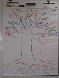 One of the exercises we do in a Basic AVP workshop is a brainstorm on the topic, “What is Violence?” Participants say whatever word or short phrase comes to mind when they think of violence and it is transcribed onto a sheet of poster paper. It is a word storm of ideas. No one’s idea is censored. When the storm passes and the ideas cease, we look at what we have written, noting the things that surprise us and the things that confuse us. Usually a good discussion follows on violence and how the group has experienced it in their lives.